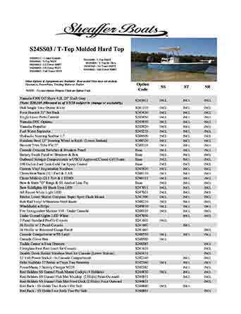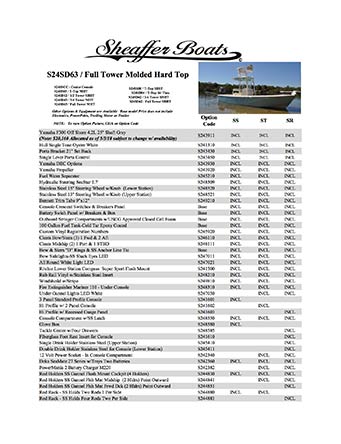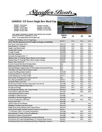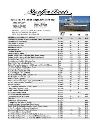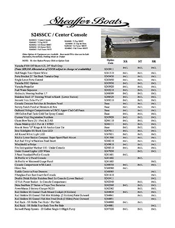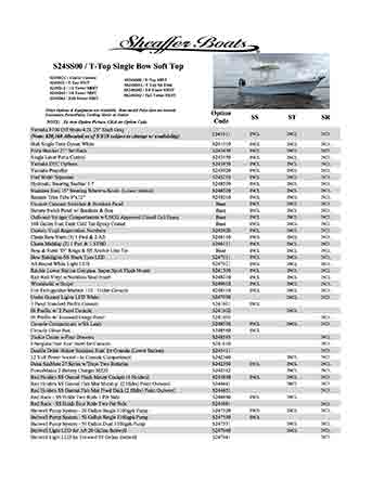 S240 Model PDF Sheets Download PDF/Print S24SSCC / Center Console S24SS00 / T-Top Single Bow Soft Top S24SS03 / T-Top Molded Hard Top S24SD12 / 1/2 Tower Single Bow Hard Top S24SD33 / T-Top Sit Thru S24SD42 / 3/4 Tower Single Bow Hard Top S24SD43 / 3/4 Tower Molded Hard Top S24SD62 / Full Tower Single Bow Hard Top S24SD63 / Full Tower Molded Hard Top